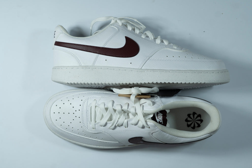 Step up your sneaker game with the Nike Court Vision Low in a clean white and maroon colorway. Inspired by classic basketball shoes, these sneakers combine retro style with modern comfort. The smooth leather upper offers durability and a premium look, while the perforated toe box ensures breathability.