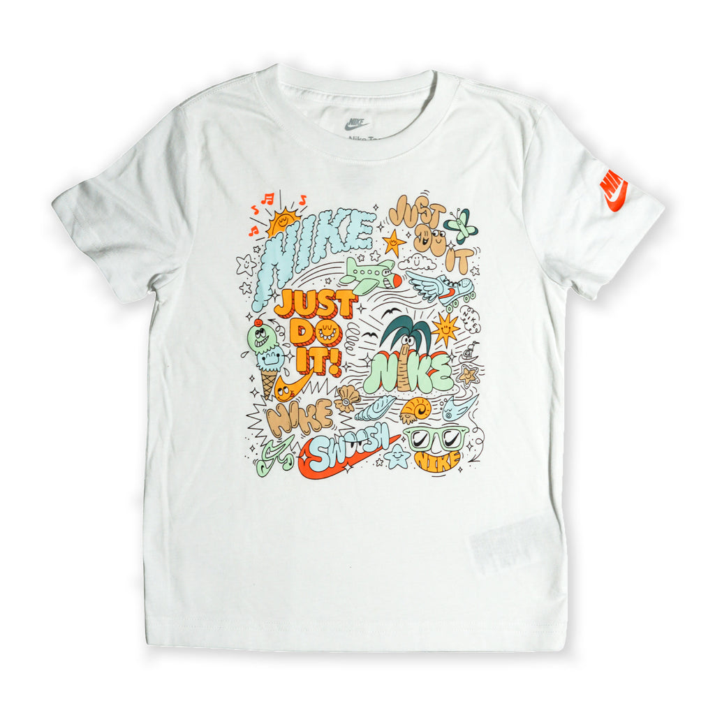 The Nike Kids “Just Do It” Doodle Tee brings fun and creativity to the classic Nike look. Covered in colorful cartoon-style graphics and bold “Just Do It” text, this tee captures the playful energy of youth. Made from soft cotton fabric, it’s designed for all-day comfort and easy movement—perfect for school, play, or relaxing at home.