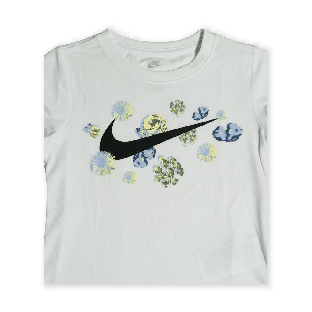 Add a touch of fun and flair to her everyday look with the Nike Girls “Floral Swoosh” Tee. This soft white T-shirt features Nike’s iconic Swoosh logo surrounded by delicate floral graphics in blue, yellow, and green tones. Made from lightweight cotton fabric, it’s perfect for all-day comfort, whether she’s on the move or relaxing.